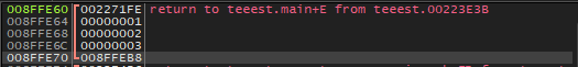 What we see here is that main() pushes 3 numbers onto the stack and calls f(int, int, int).