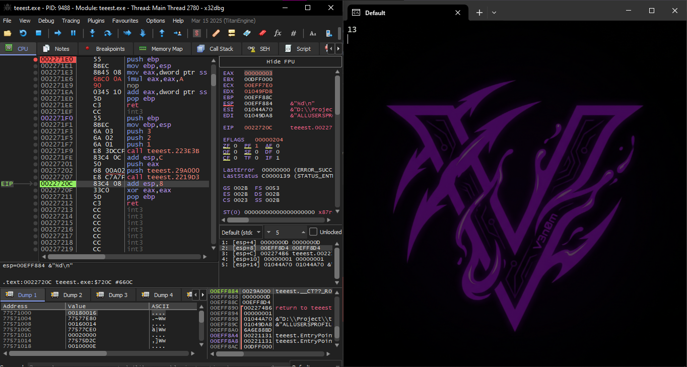 And I said to do another experiment to confirm my understanding of the Assembly code, which is that I wanted to make it output finally like 13 for example, and the supposed equation is a*b+c, and to return number 13, I had to change the b and make it 10 so that it becomes 1*10+3 = 13, and I changed it in this Instruction imul eax, dword ptr ss:[ebp+0x0C] and made it imul eax, eax,A and indeed it gave me the result I want