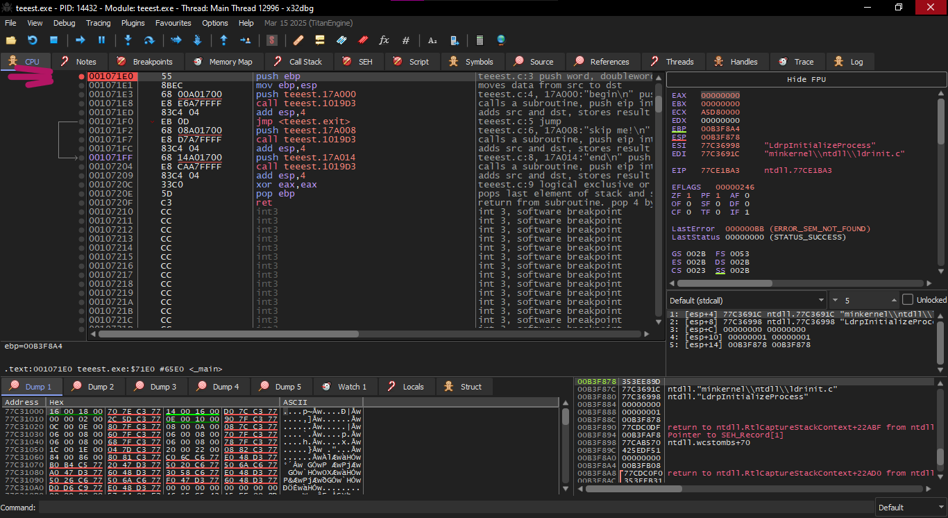 cl /Od /Zi teest.c ; compile teest.c with optimization disabled (/Od) and debug info (/Zi); this command compiles the C file into an executable with debugging symbols