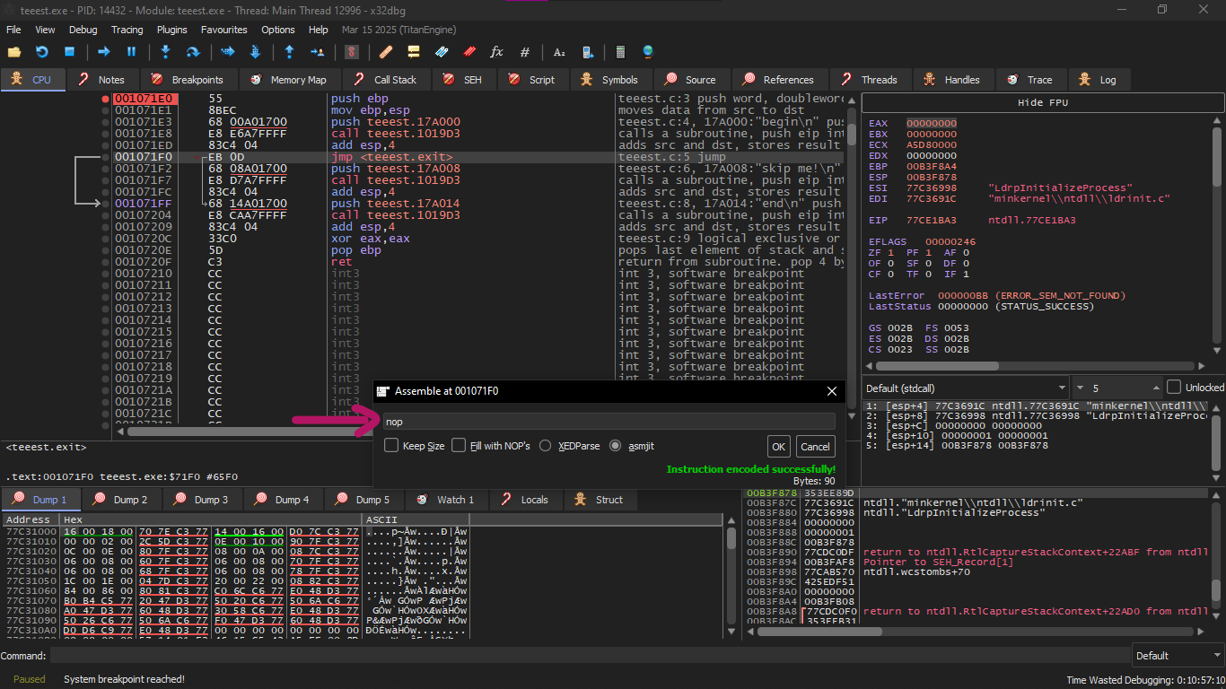 Now we will try to cancel the jmp operation so that it prints what's after it without going to Exit