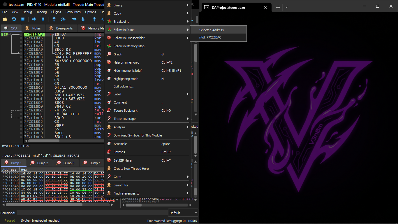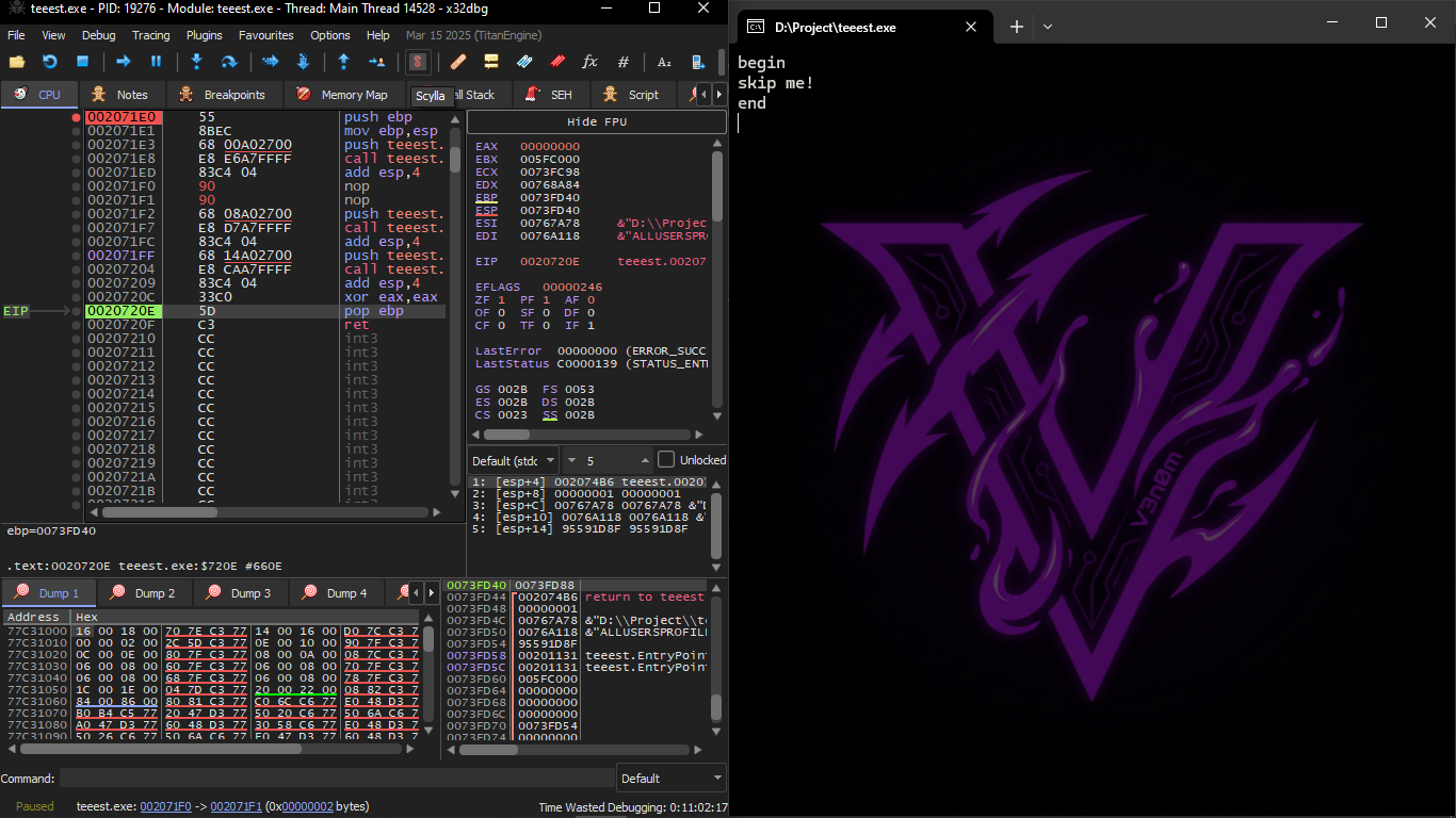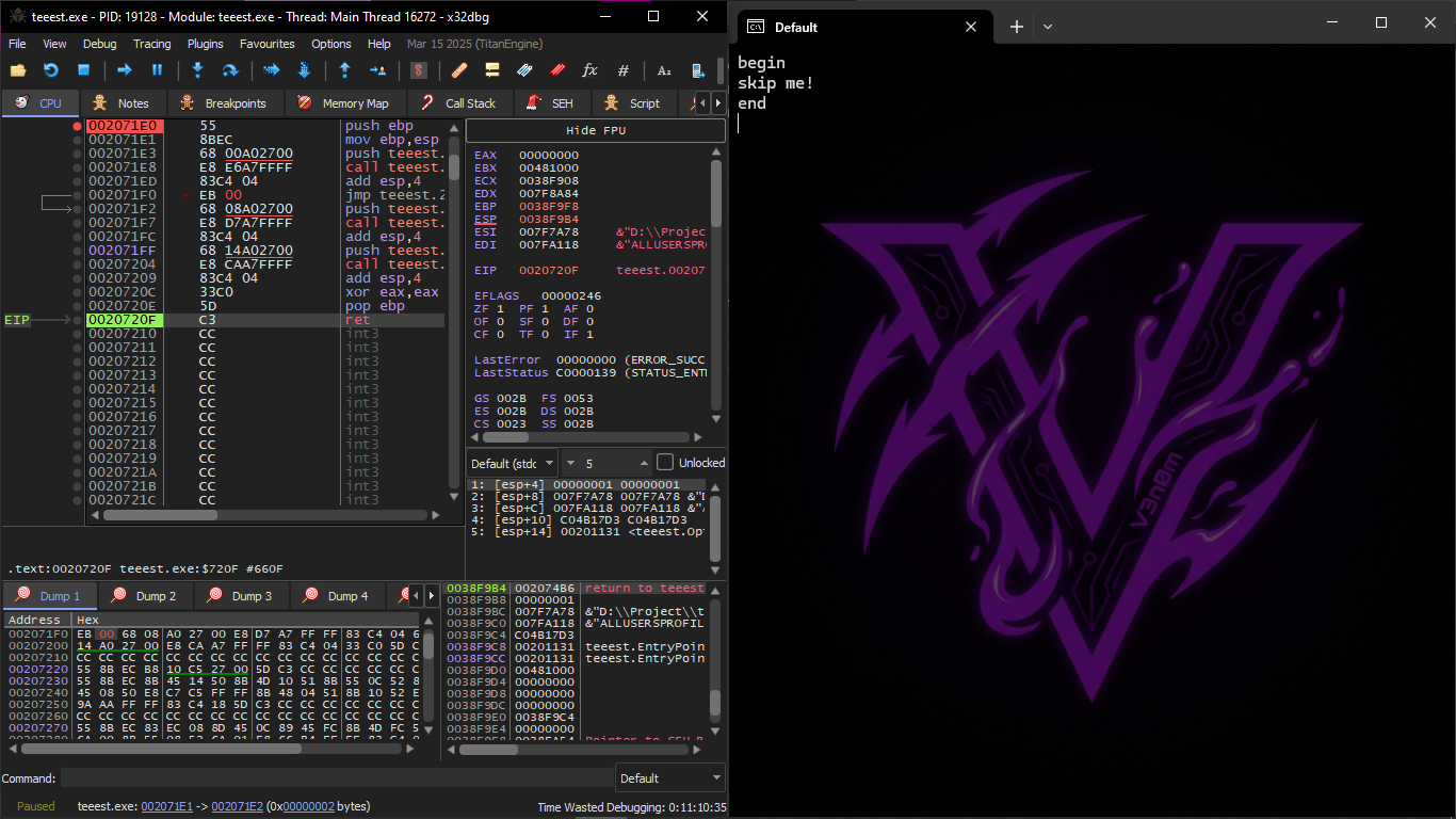 We open the resulting executable in x32dbg (he did it on Hiew but I will do it on x32dbg)