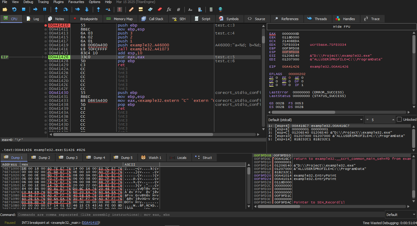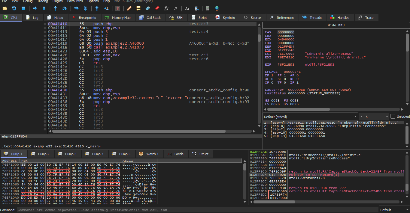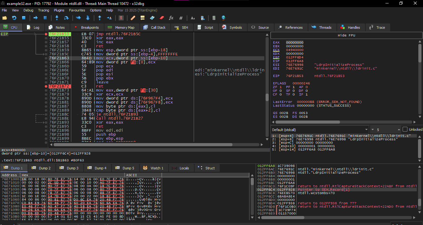 Initially after I made the C code and converted it to an EXE file I opened it in x32dbg and the first thing it stopped me at was the first Breakpoint which will be at ntdll.ll