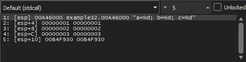 To see how the rest of the arguments are passed on the stack, we increase the number of parameters to 9 (format string + 8 ints):