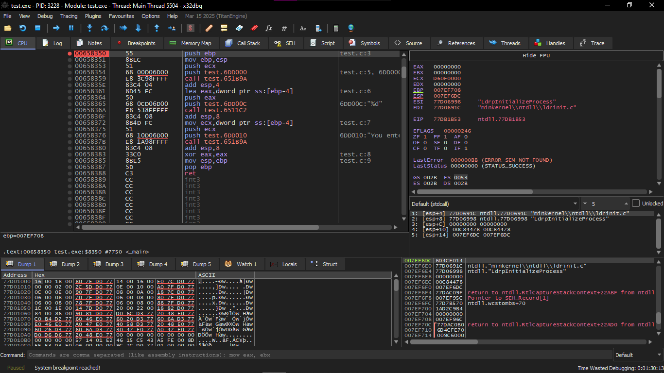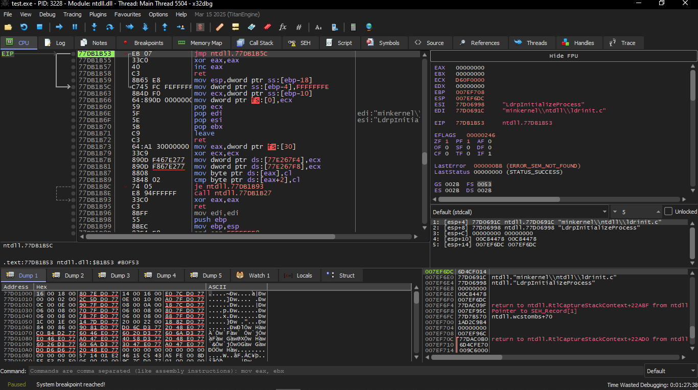 We start opening it on the X32dbg and we will notice that we are first inside the ntdll.ll