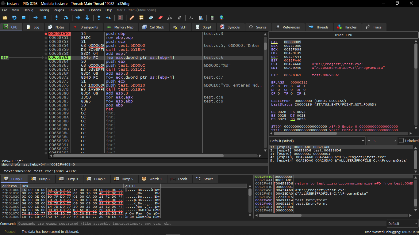 In the instruction which is push test.6DD000 this you will find it putting the address of this text Enter X:\n