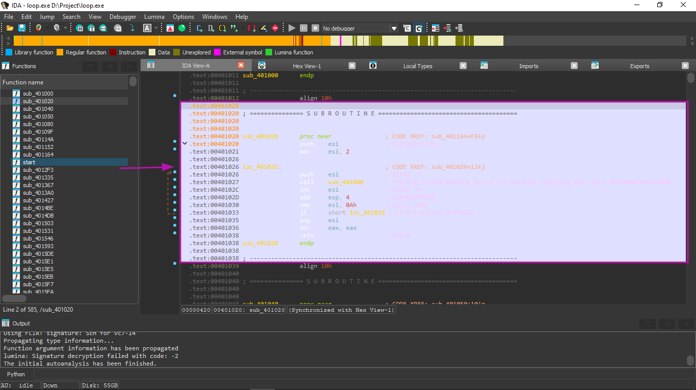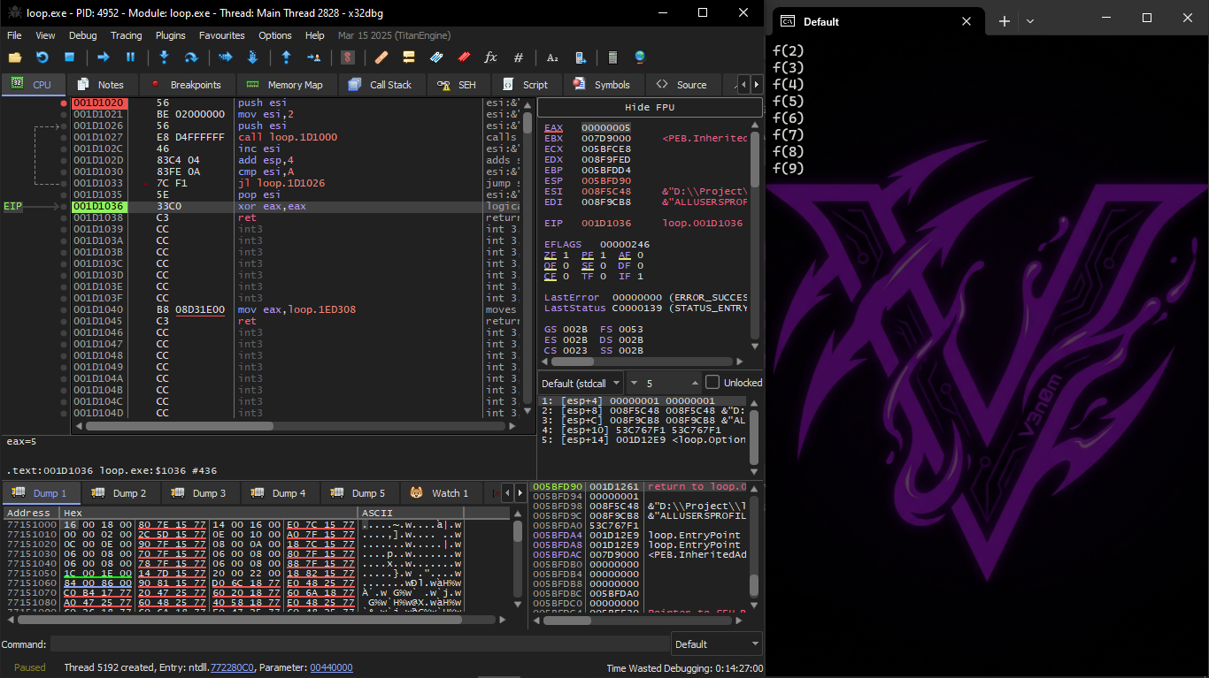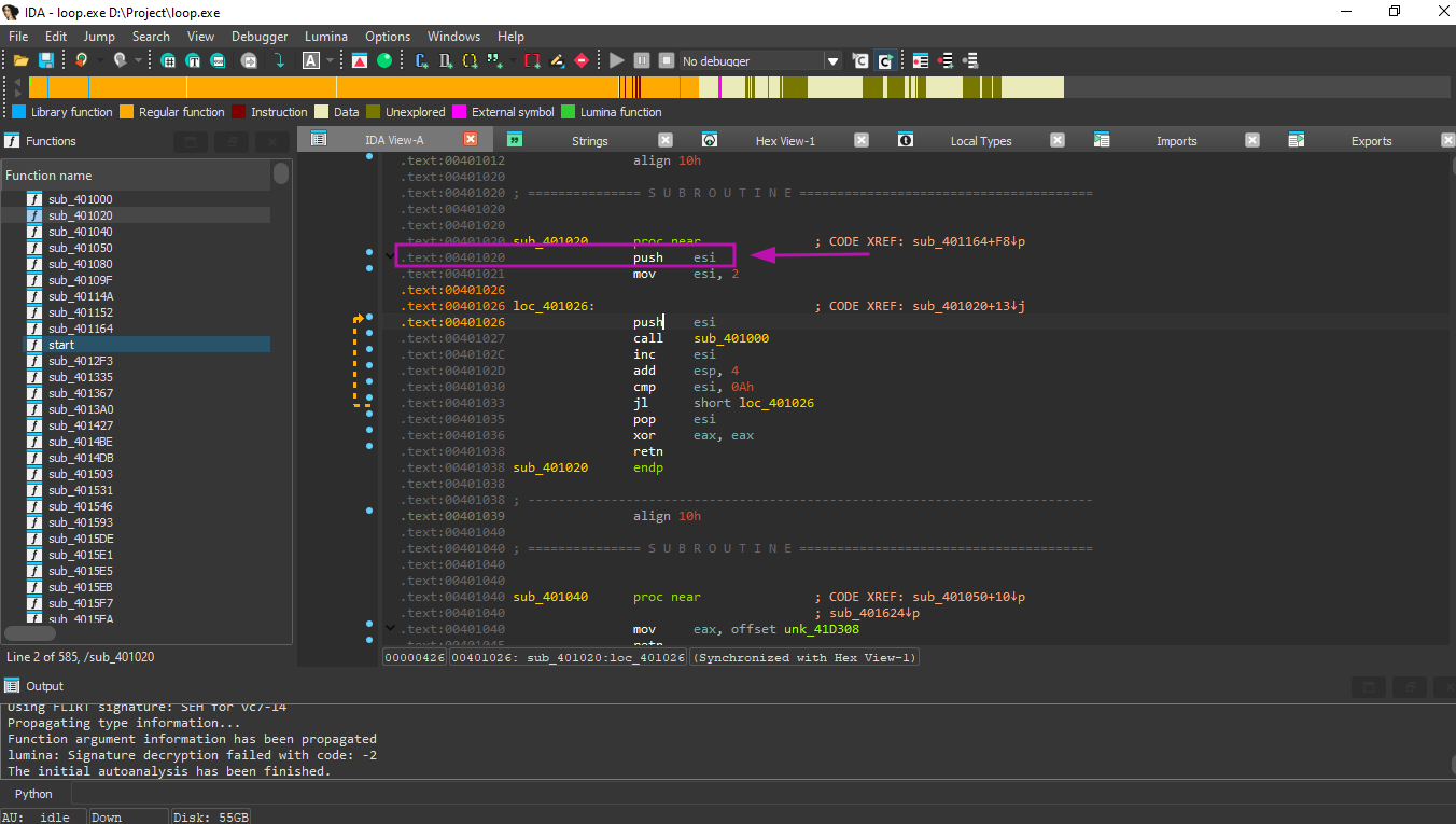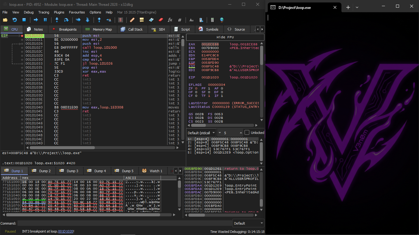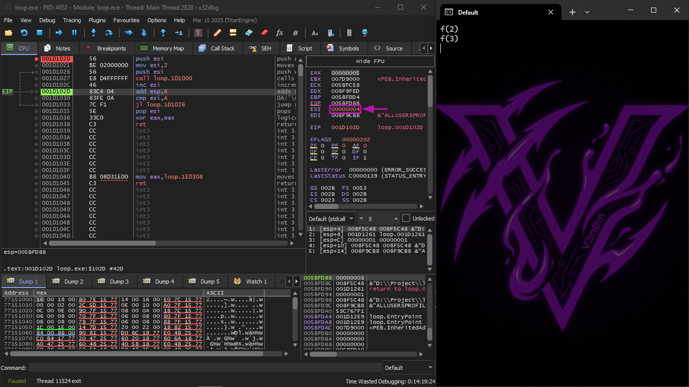 Another very important point: the printing_function() function must not change the value of ESI. The compiler is confident of this. If the compiler decided to use ESI inside printing_function(), it would have to save its value at the beginning and restore it at the end, as we saw with PUSH ESI / POP ESI.