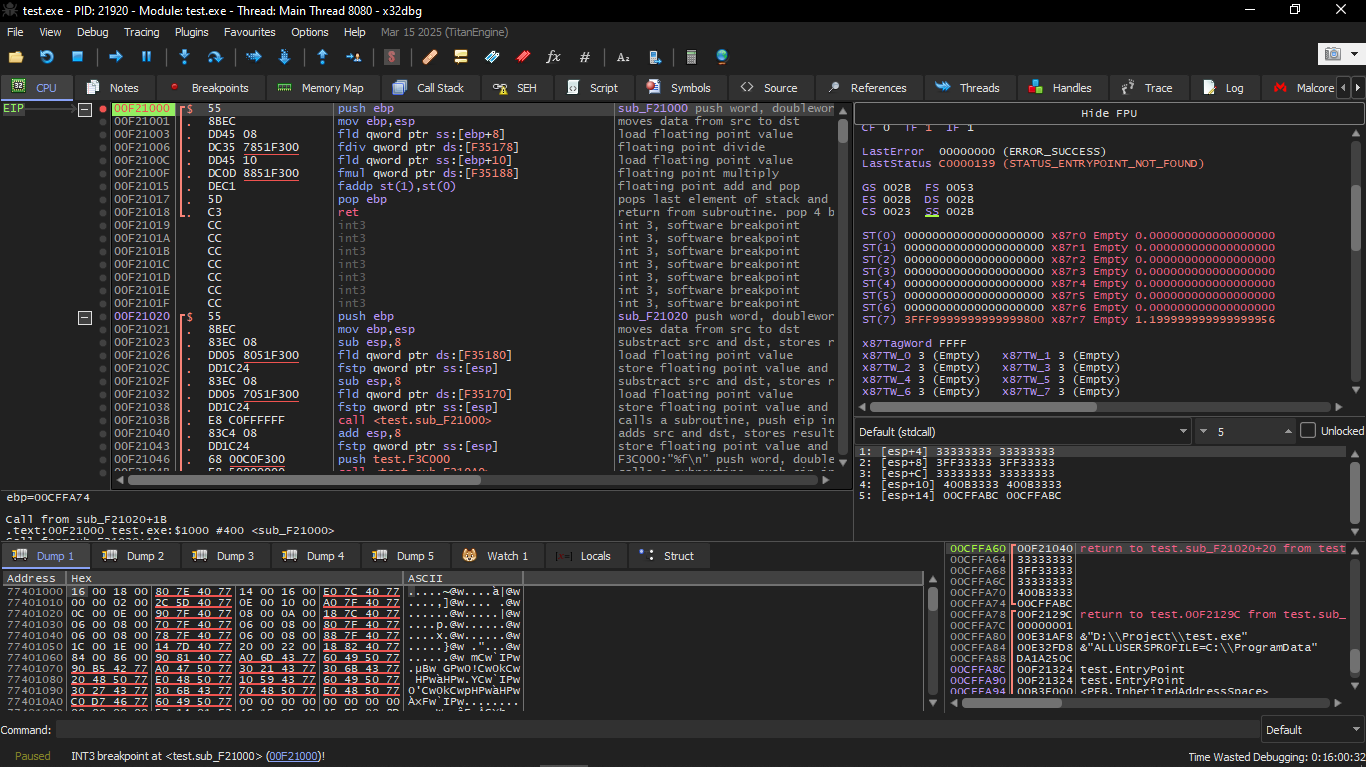 Now EIP is pointing to the next instruction (FDIV), which loads a double (constant) number from memory.