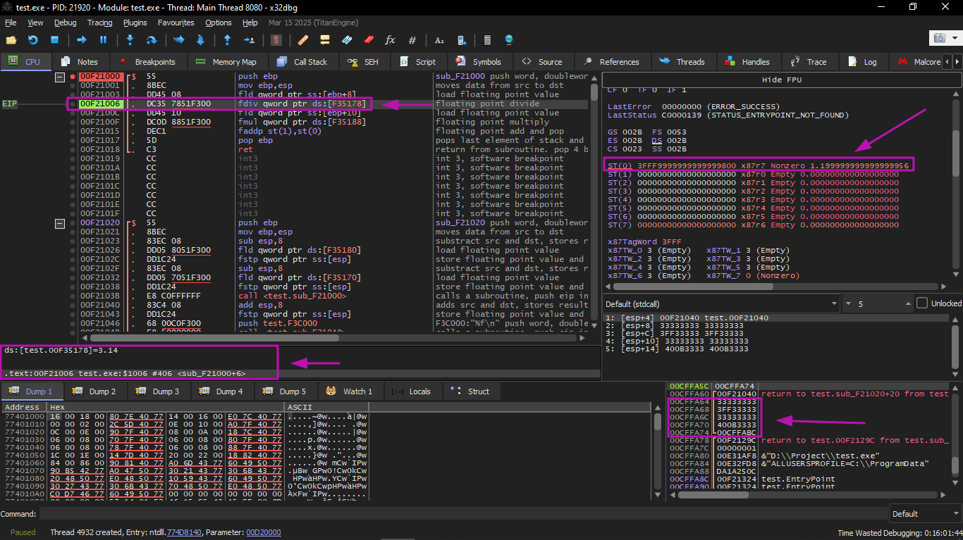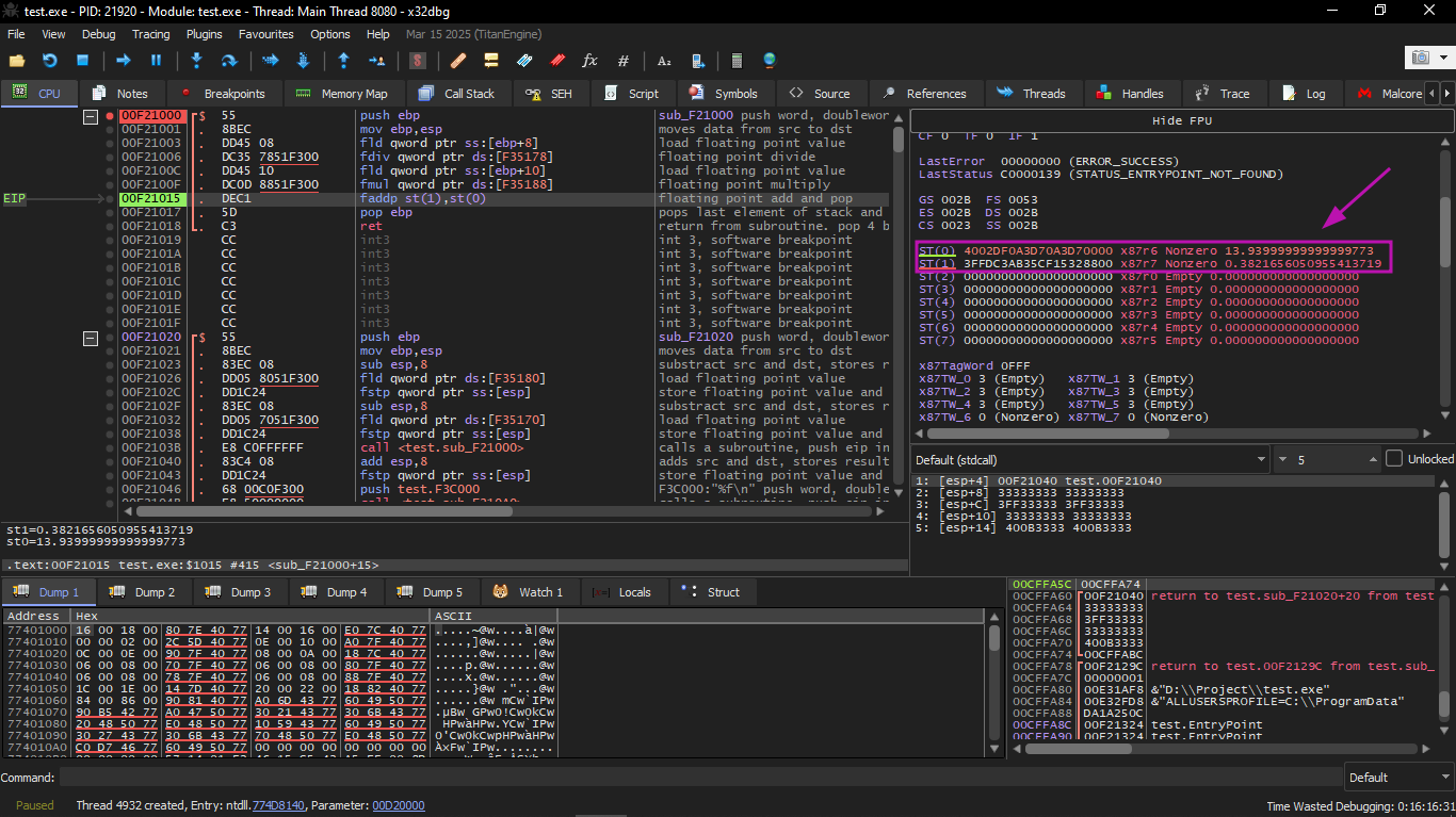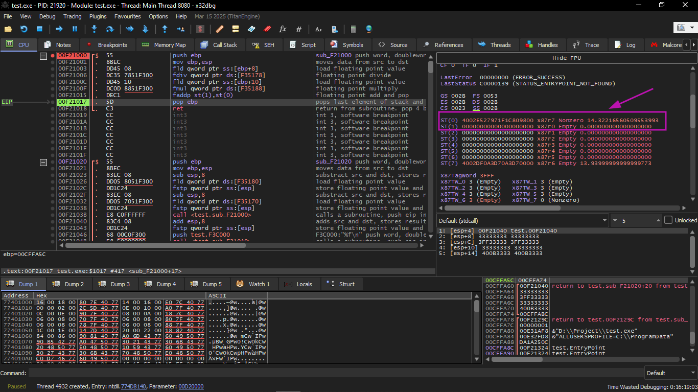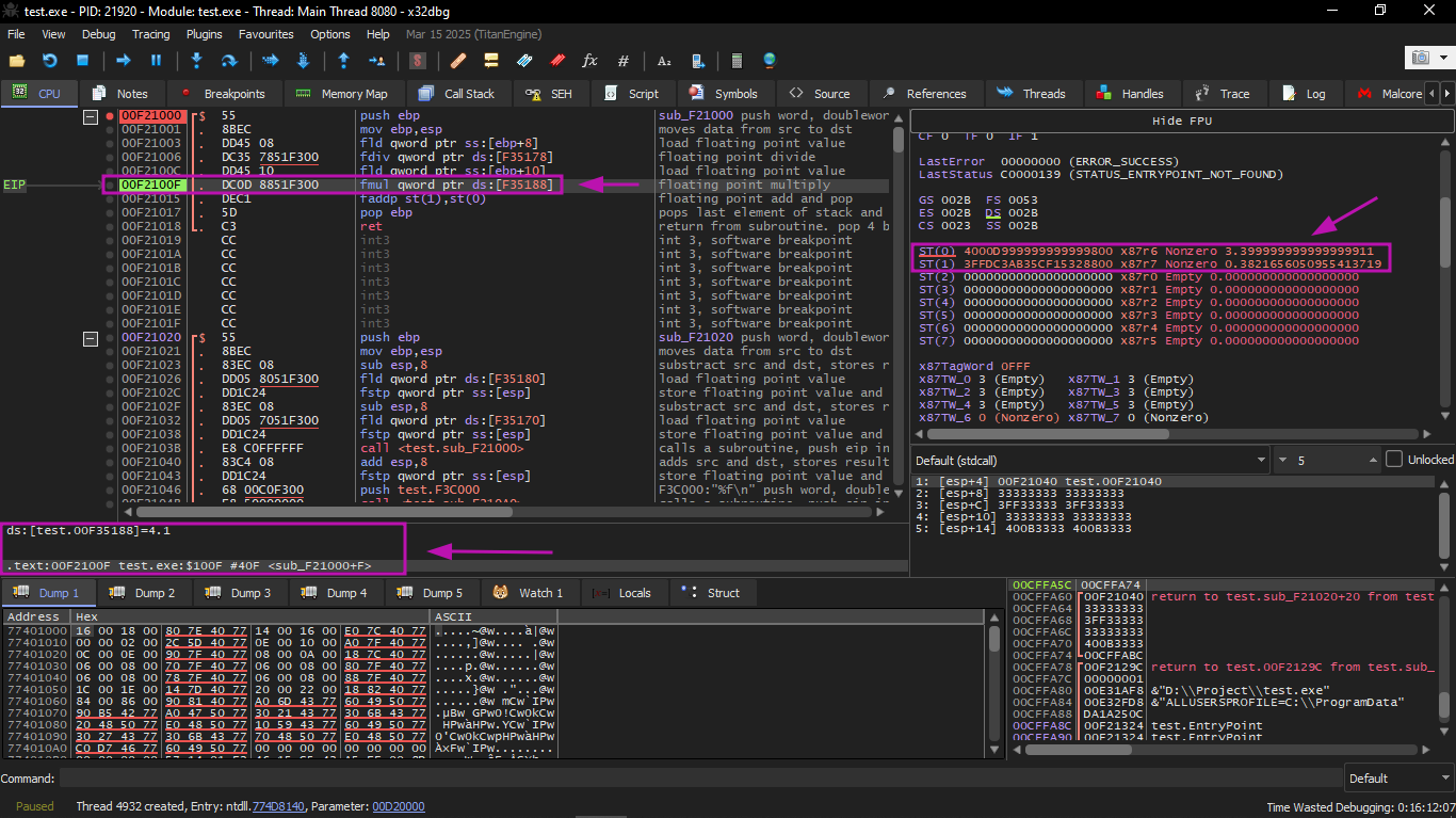 At the same time, the result of the division was pushed into ST(1). Now EIP is pointing to the next instruction: FMUL. It loads the constant 4.1 from memory.